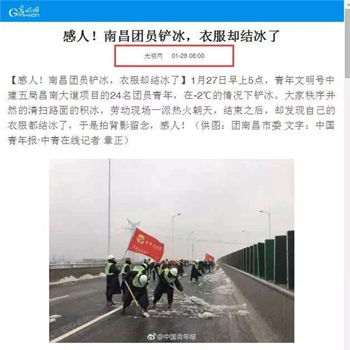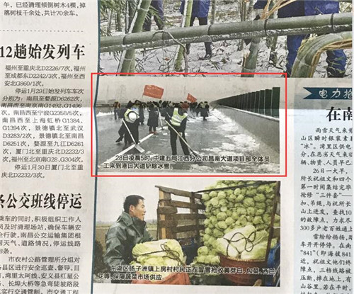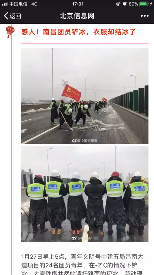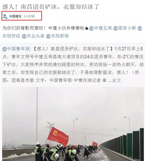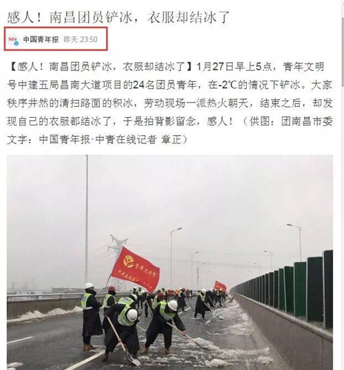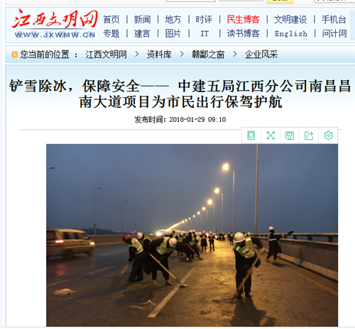 1月27日,土木公司江西分公司南昌昌南大道项目积极响应南昌市政府组织的“冰雪无情人有情”的号召。项目全体员工前往南昌市主干道港口大道铲除冰雪,保障市民交通出行。光明网、中国青年报、北京信息网、中国建筑官方微博、中国江西网、江西文明网、南昌日报等7家媒体第一时间进行报道。