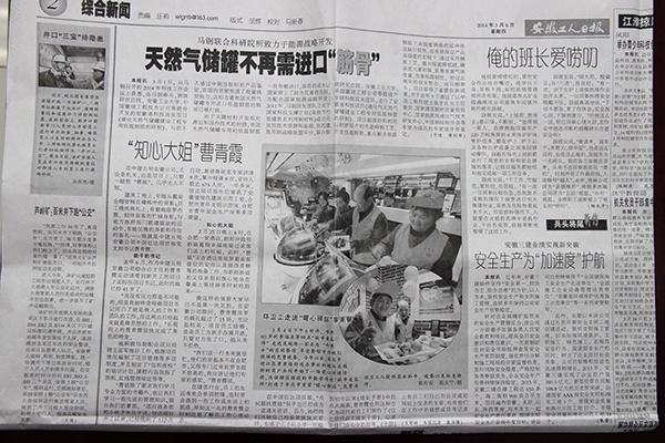 《安徽工人日报》由安徽省总工会主管主办,是一份专门关注报道工人先进事迹的报纸,展现了各行各业工人们的风采。五局人十多年来一直为安徽地区的建设贡献力量,因而也成为《安徽工人日报》关注报道的对象。在“三八”妇女节来临之际,该报记者戴恒曙在了解了安徽公司项目女书记曹青霞十年如一日在建筑行业兢兢业业,关爱员工的婚姻、工作和学习的事迹后,刊发了曹青霞的故事,并以“知心大姐”来形容这位贴心能干的建筑业女员工。在文中,记者以“能干的书记”、“知心的大姐”为小标题,讲述了曹青霞如何在这个男性驰骋的领域中迅速脱颖而出;如何在忙碌的工作之余,为项目员工的婚姻大事而张罗忙碌;如何指导新员工们快速成长成才等等一系列故事,展现了新时代建筑女性的风采。