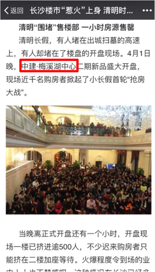 此次开盘的火爆引发了强烈的连锁效应,不仅业内人士纷纷感叹盛况的空前绝后,搜狐焦点、新浪乐居、搜房网、吉屋网等权威房产媒体也争相报导,以“时光盘”、“首开售罄”、“劲销1.5亿”等为关键词的新闻报道也纷纷出街,长沙楼市著名的自媒体大号地产中文系,更是以《长沙楼市正处在“最美妙局面”? 》为题,将中建·梅溪湖中心作为长沙楼市火爆的典型样本进行分析。