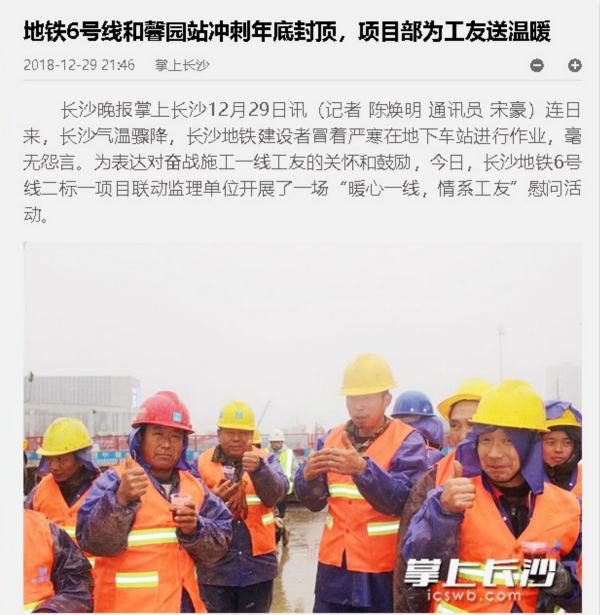 连日来,长沙气温骤降,一线工友冒着严寒大雪在地下车站进行作业,工作十分辛苦。为表达对奋战施工一线工友的关怀和鼓励,12月29日,长沙地铁6号线二标第一项目部联动监理单位,在和馨园站现场开展了“暖心一线,情系工友”慰问活动。该活动得到了《长沙晚报》的关注并进行了专题报道。