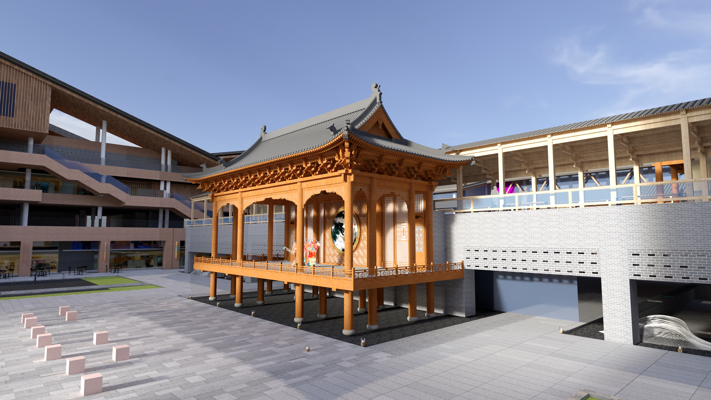 项目为体现“古韵新风”的形象特色,深层次表达非遗底蕴深厚的文化内涵,将“以人为本”的设计理念贯穿建设始终,戏楼、厢房、围廊、南大门连廊工程等单体建筑均为木结构设计,是仿明清时代建筑。戏楼主体结构为古木榫卯结构,主要采用非洲菠萝格木、松木等材料,建筑为二层单檐歇山屋面,其屋面等级仅次于庑殿顶,在整个建筑群中处于重要地位;东西厢房为一主二配悬山结构,由环形围廊将各建筑联系起来,厢房室内采用400*400*60手工仿古青方砖铺地十字缝隙墁,桐油磨细钻生,与建筑整体的设计形成呼应。其中最具有代表性的是张弦木结构,位于展示馆主入口处,共设九榀张弦梁,每榀设撑杆5根。张弦梁上弦为非对称人字形拱,下弦为带转折的圆弧索形。自平衡体系结构,各部分之间高低错落,极富有层次感。