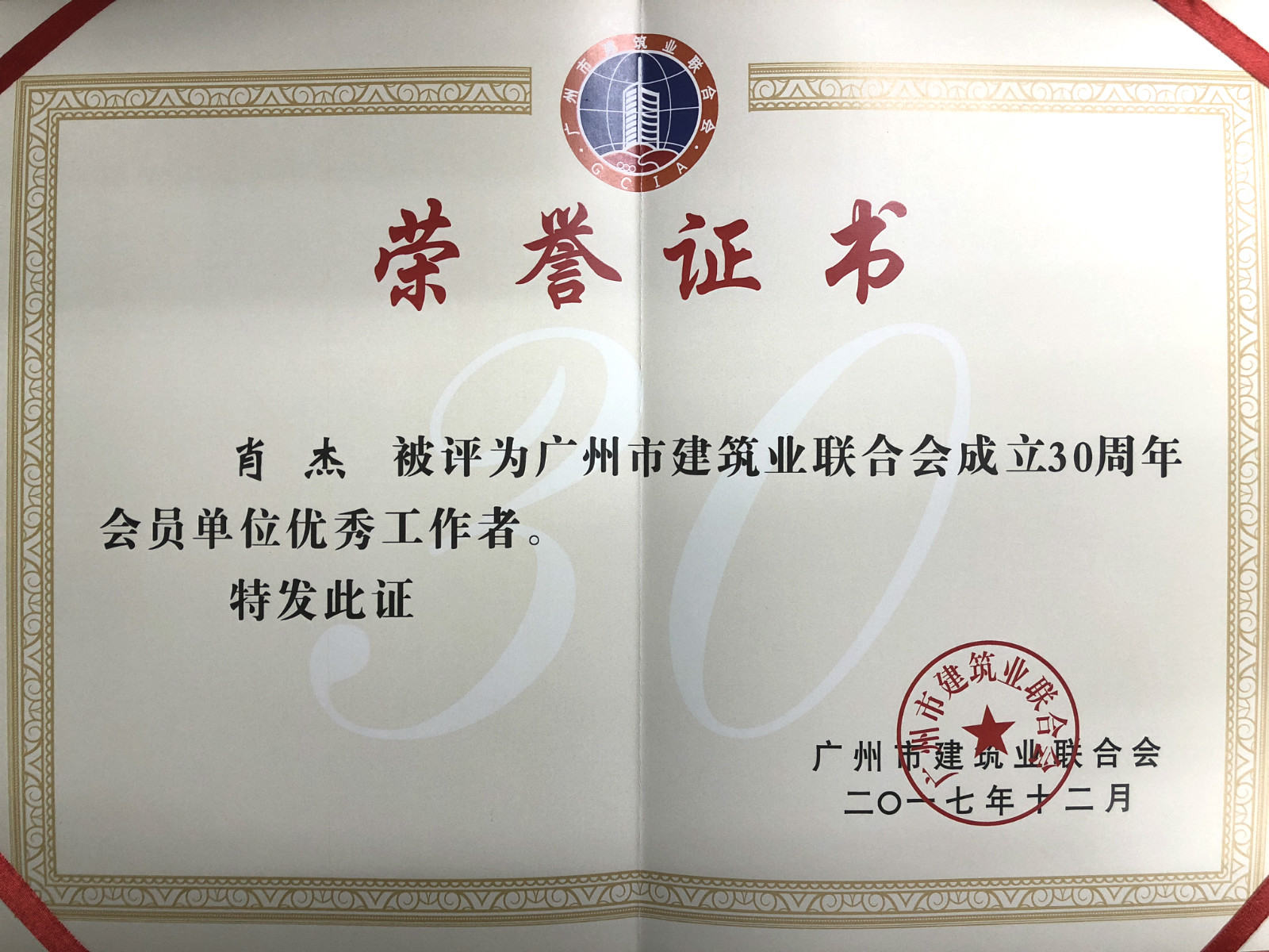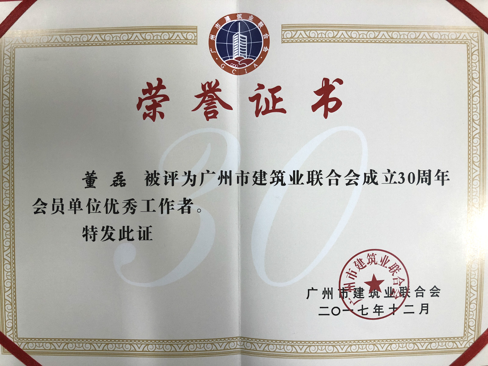 为表彰中建五局为广州市建设作出的贡献,大会为中建五局颁发了“优秀建筑企业”、“建筑工程安全文明施工样板工地创建先进单位”、“建设工程质量创优先进单位”三项集体荣誉,为广州分公司总工程师肖杰、项管部经理董磊颁发了广州市建筑业联合会成立30周年会员单位“优秀工作者”证书。