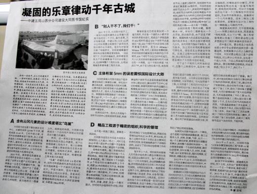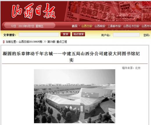 《山西日报》2013年6月5日C9版重点工程版面刊发《凝固的乐章律动千年古城——中建五局山西分公司建设大同图书馆纪实》,详细报道了五局北京公司山西分公司的大同图书馆项目施工经验。