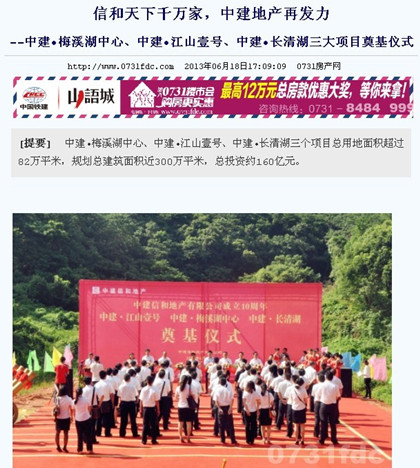 2013年6月18日,时值中建信和地产成立10周年之际,在长沙、济南两地同步举行中建·梅溪湖中心、中建·江山壹号、中建·长清湖三大项目奠基仪式。