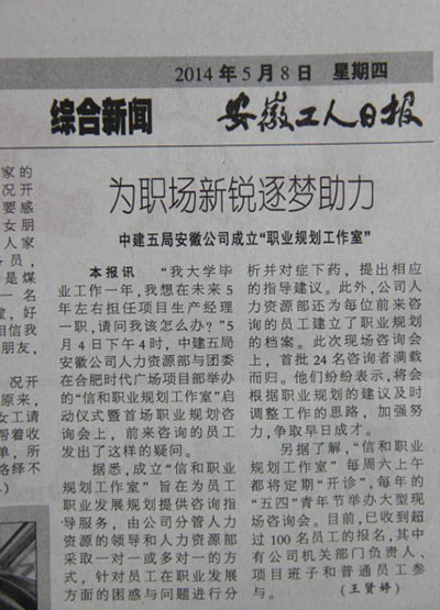 安徽公司成立职业规划工作室的消息吸引了《安徽工人日报》的关注,5月8日,该报以“为职场新锐逐梦助力——中建五局安徽公司成立‘职业规划工作室’”为题,报道了安徽公司职业规划工作室为员工职业发展规划提供咨询指导服务的故事。(王贤婷)
