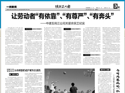 6月11日,由陕西省总工会主管的省部级报刊《陕西工人报》3版,以《让劳动者“有依靠”、“有尊严”、“有奔头”——中建五局三公司关爱农民工纪实》为题,大篇幅报道三公司关爱农民工事迹。