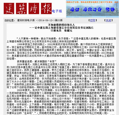 2014年6月12日,《建筑时报》以“不知疲倦的项目领头人”为题报道了浙江分公司党总支书记兼嘉里中心项目刘凯仁。通过“抓质量赶进度,解决难题的‘专家’”、“创品牌树形象,齐心协力战嘉里”、“便施工节工期,管理创优出效益”讲述了一个“超英式”的好书记,一个中建五局的好干部。