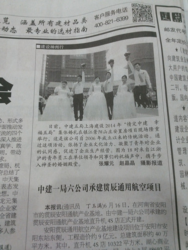2014年6月26日,《建筑时报》图文报道了中建五局上海建设2014年“情定中建 幸福五局”集体婚礼,展现了企业发展为员工带来的“幸福、福利、自豪”。