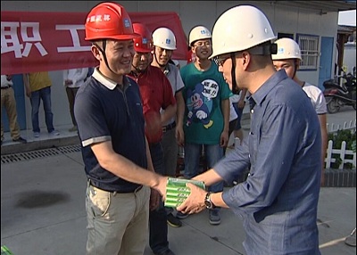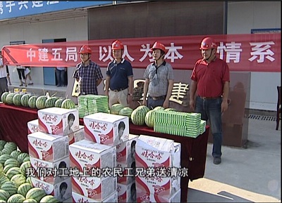 芜湖电视台在报道中说道,“现场虽然天气闷热,但天和苑项目上千名工人为确保工程进度依就紧张奋斗在施工一线。为保障奋战在施工一线的作业人员安全生产,施工单位中建五局及时送关爱,送清凉,切实体现了一个国企的形象”。项目负责人徐玉虹在采访过程中表示,对于奋战在施工一线的农民工兄弟,我们要从生活上关心他们、安全上保障他们。项目部目前已经为工人们准备了防暑药品、西瓜、饮料,并专门熬制了绿豆粥等。我们将采取一系列措施,尽最大努力,确保高温天气安全生产。