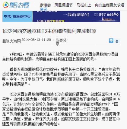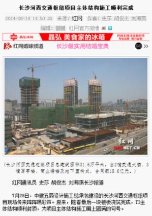 近日,中华建筑报、红网和大湘网多家主流媒体报道了中建五局长沙河西交通枢纽工程主体结构顺利封顶。