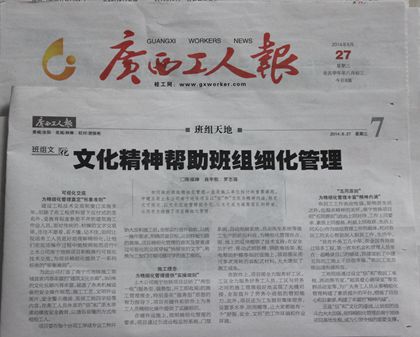 在对南宁地铁项目一系列文化建设进行认真调研后,项目以“信·和”文化为精神内涵,将文化可视化、以文化促管理抓手化、让文化成为凝聚团队的桥梁,从而有力助推了项目精细化管理三大方面为内容主线,撰写了《文化精神帮助班组细化管理》的长篇通讯,近日刊登在《广西工人报》上。
