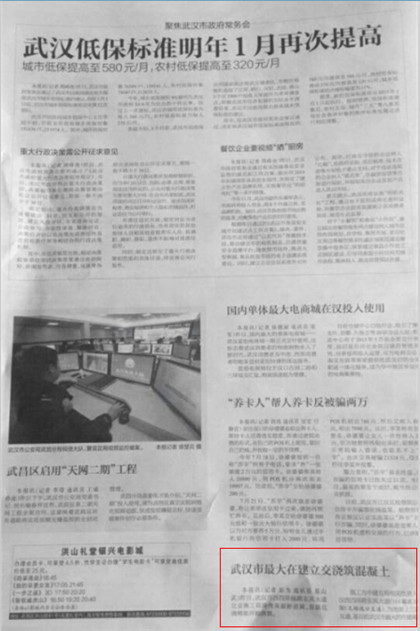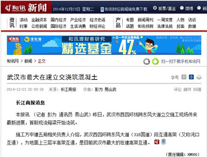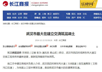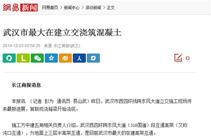 12月23日,长江商报、网易网、和讯网多家媒体以“武汉市最大在建立交浇筑混凝土”为题,对土木公司承建武汉西四环项目跨东风大道立交施工的最新进展情况进行报道。武汉西四环跨东风大道(318国道)处互通高架,为地面上三层半高架互通,是目前武汉市最大的在建高架互通。