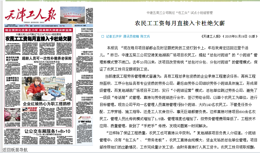 值得一提的是,在小班组管理模式中,农民工直接由规模大、资金充裕的总包单位管理,项目部按照他们的出勤情况、工作完成量计发工资,由财务直接打到小班组。农民工按月领取报酬,避免出现“包工头”拖欠、私吞工人工资的情况。此外,与劳务公司相比,总包单位管理水平更高、服务意识更强,农民工生活质量也得到提升。(陈文兵)