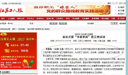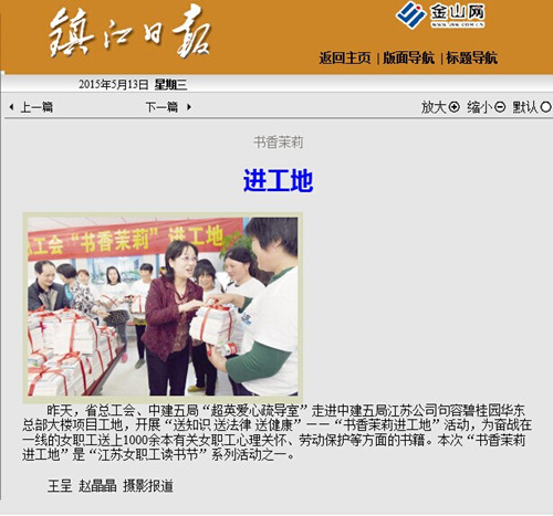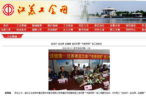 2015年5月12日,由江苏省总工会主办、中建五局“超英爱心疏导室”承办的“送知识 送法律 送健康 书香茉莉进工地”活动在中建五局碧桂园华东总部大楼项目工地成功举办。此次活动反响热烈,不仅深受女职工的欢迎,还获得江苏省总工会、句容市总工会、中建五局工会、中建五局华东建设工会等各级领导的一致好评。