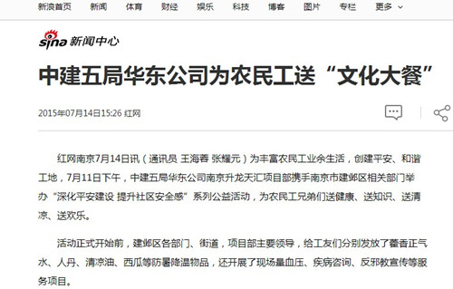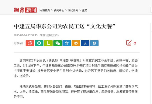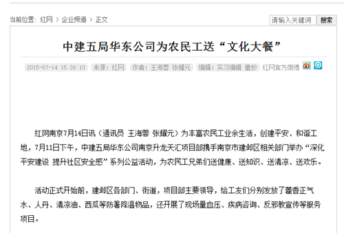江苏卫视、红网、新浪、网易等十余家主流媒体齐赞中建五局华东公司为农民工送“文化大餐”活动