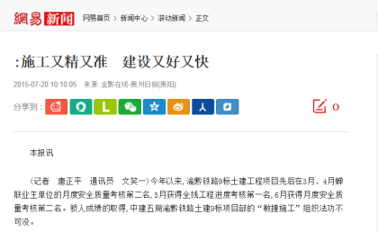 “敏捷施工体现的就是精准、快速、高效……”报到详细地对隧道公司敏捷施工渝黔铁路情况进行了报道,对敏捷施工带来的经验进行了宣传引导,为其他标段树立了榜样。