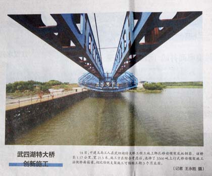 近日,中建五局首台3300吨上行式智能移动模架在土木公司吴楚大道项目顺利完成预压施工,这标志着中国建筑最大移动模架已正式投入使用,湖北日报以“武四湖特大桥创新施工”为题对该项目移动模架进行了报道。