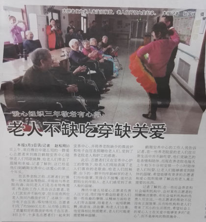 3月份是学雷锋全民志愿服务行动月,为更好地弘扬传承“雷锋精神”,倡导“奉献、友爱、互助、进步”的志愿者精神,彰显社会主义核心价值观,3月5日,山东公司潍坊大观项目部自发组织来到当地敬老院,为那里的老人们带去欢笑。齐鲁晚报今日潍坊头版对项目部的志愿者行动进行了宣传报道。