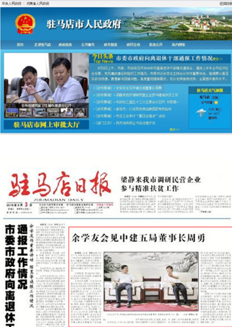 8月2日下午,中建五局董事长、党委书记周勇拜会驻马店市委书记余学友,拜会活动得到了驻马店市委市政府的高度重视,《驻马店日报》头版头条发布周勇拜会市委书记余学友的新闻。