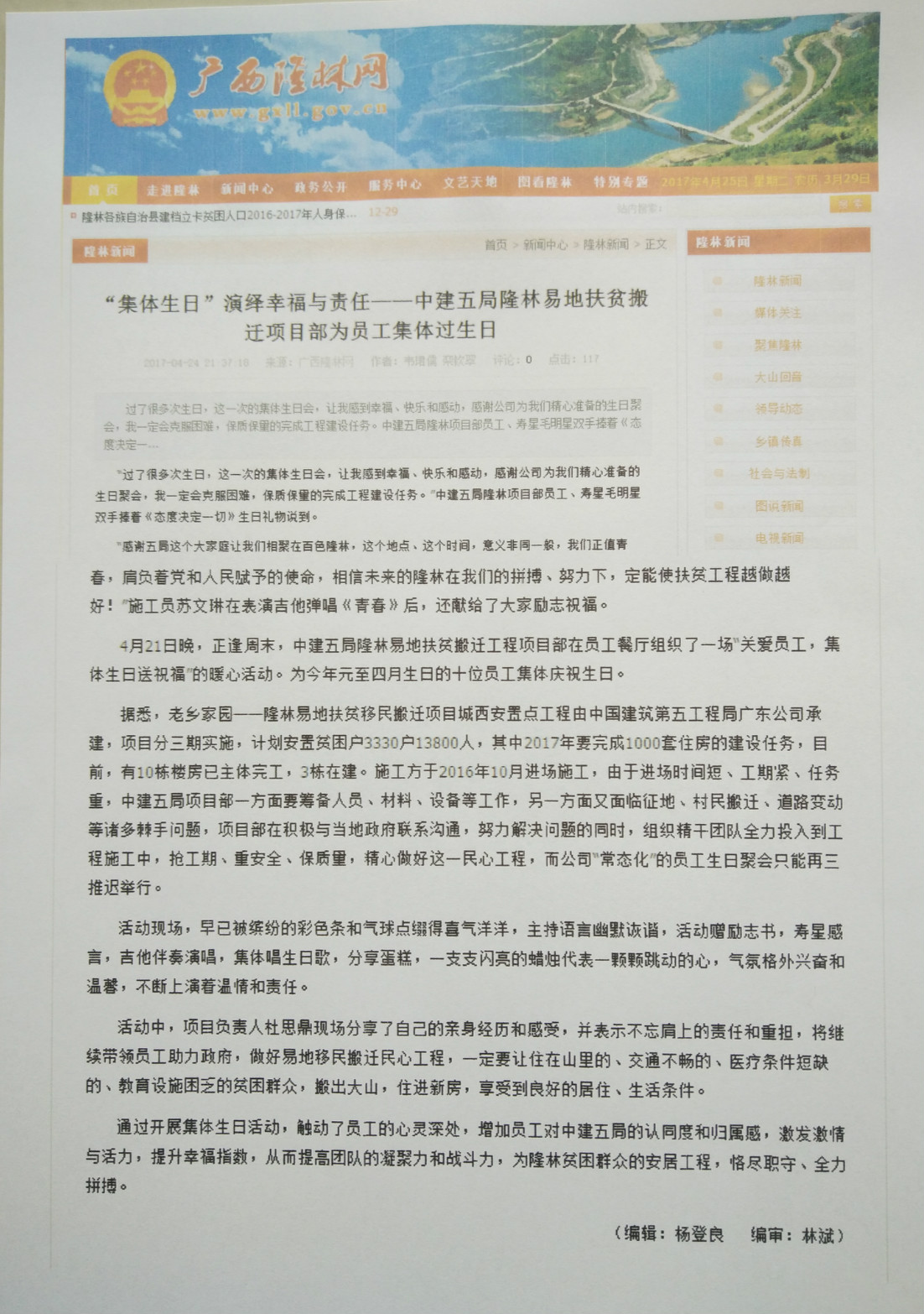 近日,《广西隆林网》刊登《“集体生日”演绎幸福与责任——中建五局隆林易地扶贫搬迁项目为员工集体过生日》,介绍了中建五局广东公司项目党支部致力于提高员工幸福指数,构建温馨家园的美好故事。