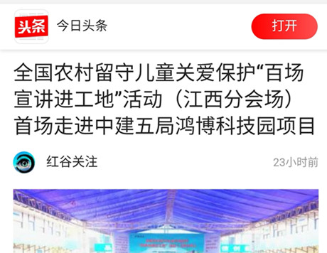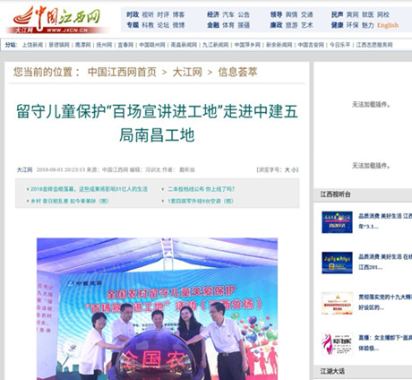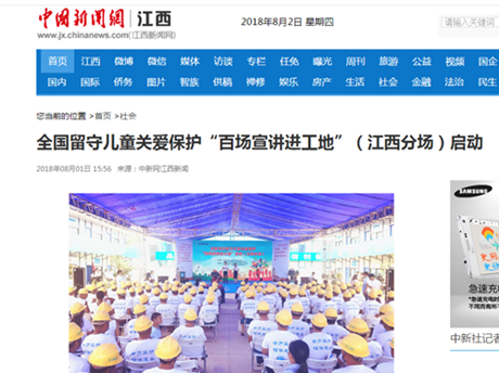 8月1日,全国农村留守儿童关爱保护“百场宣讲进工地”(江西分场)启动仪式暨首场走进中建五局活动在总承包公司江西分公司鸿博科技园项目举行。启动仪式上20名2018届新员工带来合唱《最好的未来》;来自该项目的20名一线农民工友共同发起“我是法定监护人”倡议;25名留守儿童代表开启中建五局江西分公司首届“小候鸟”暑期夏令营之旅。