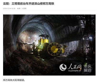 近日,人民网报道三臂凿岩台车开进深山修郑万高铁。