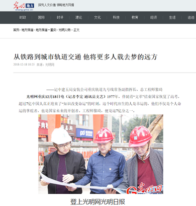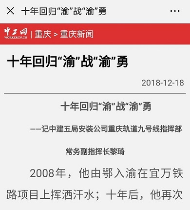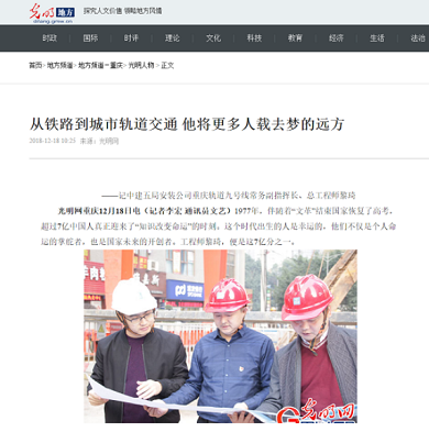 12月18日,光明网、中工网分别报道安装公司总经理助理、重庆轨道九号线指挥部常务副指挥长黎琦个人事迹,赞黎琦“回归山城,建设山城,造福山城百姓”。