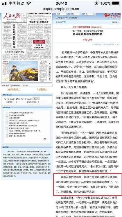 5月5日,《人民日报》头版“奋斗是青春最亮丽的底色”报道中建隧道深圳地铁13号线项目杂工马本常节日坚守一线。